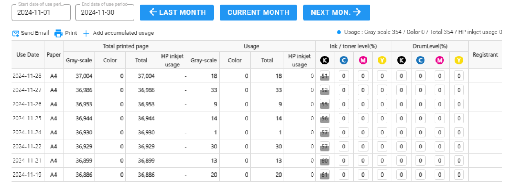 You can check real-time counter information and consumables information, and automatic monthly usage settlement and usage carryover are possible.